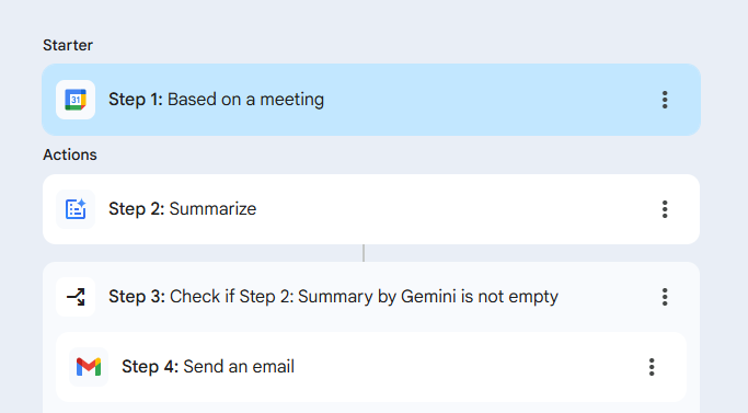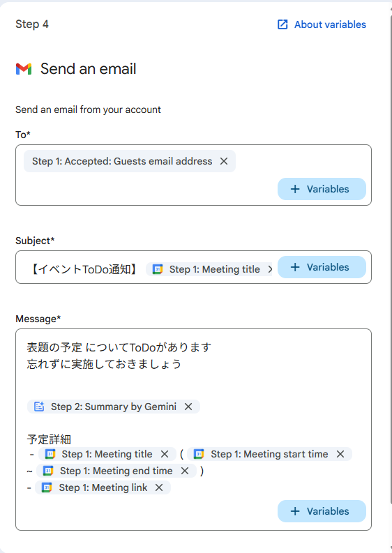 Google Workspace Flowsでもサンプルとして「カレンダーの予定の要約」や「打合せの後で出てきたタスクをメールで送る」のようなものがありました。内容としては類似したものではありますが、説明・添付資料両方から読み込むというアプローチにしたり最小限ToDoだけを送るという形にすることで「取りこぼし解消」という今回の目的に特化させています。