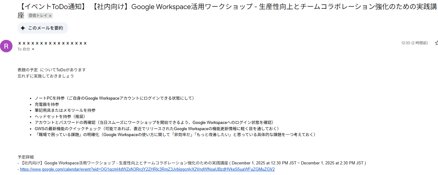 今回の機構があれば、それらの中身を読んでいなかったとしても「イベント参加に必要なToDoだけ」を抽出して知らせてくれます。それだけで、イベント参加の準備もしやすくなるでしょう。