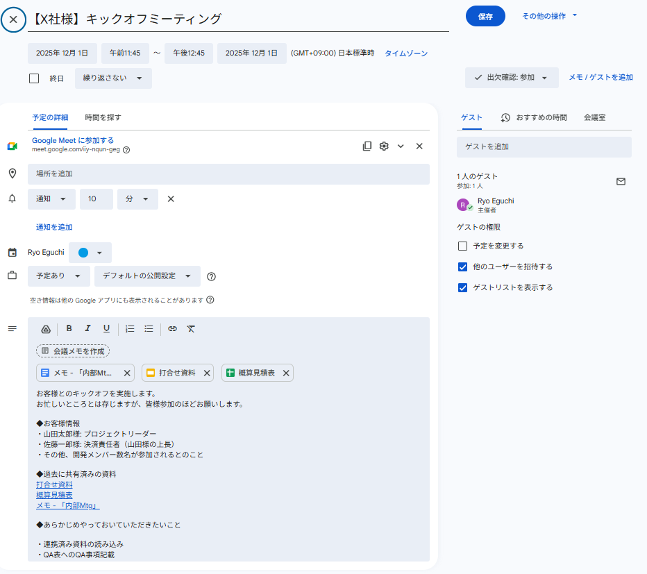 また、要約元のソースを予定の「説明」欄の記載 +  予定の添付物にすることで、今回の目的を実現させています。