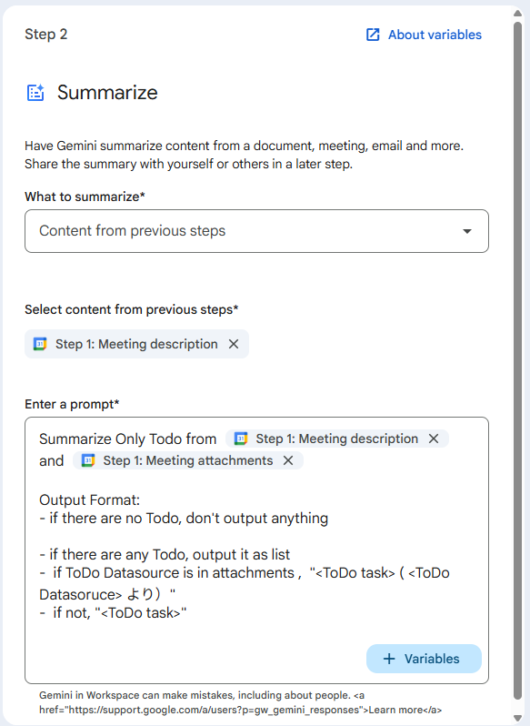 ここがすべてといっても良いかもしれません。「Content from previous steps」つまりカレンダーイベントの情報からのサマライズを行います。