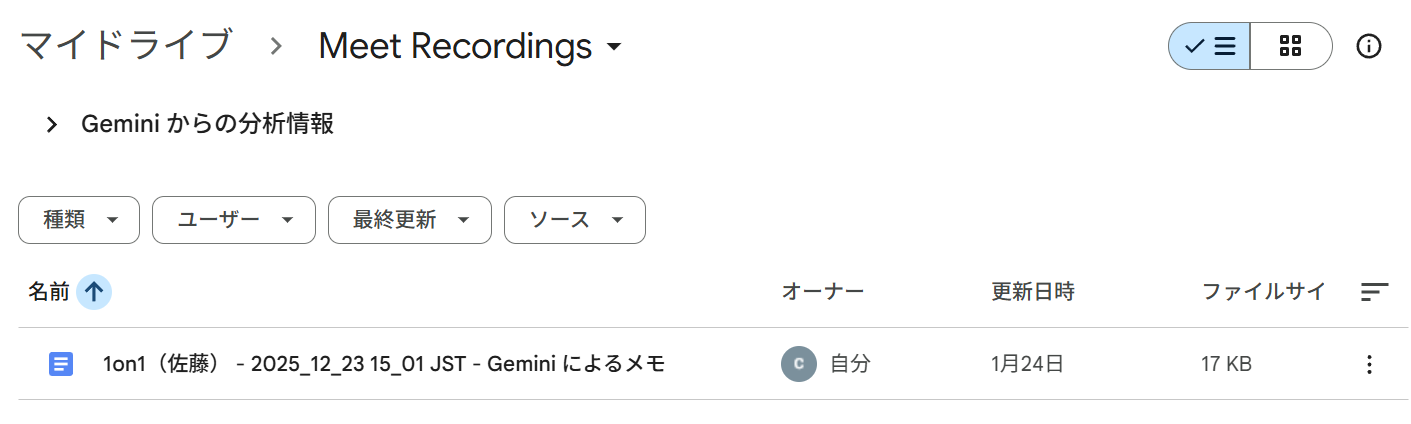 会議メモは、AIが対話の内容をリアルタイムで要約し、重要なポイントをまとめてくれる機能です。一方、文字起こしは、発言を一言一句テキストとして記録してくれます。1on1を開始する際にこれらを有効にすると、会議終了後に「会議メモ(文字起こし付き)」のファイルがドライブ内の「マイドライブ」-「Meet Recordings」フォルダへ自動的に保存されます。
