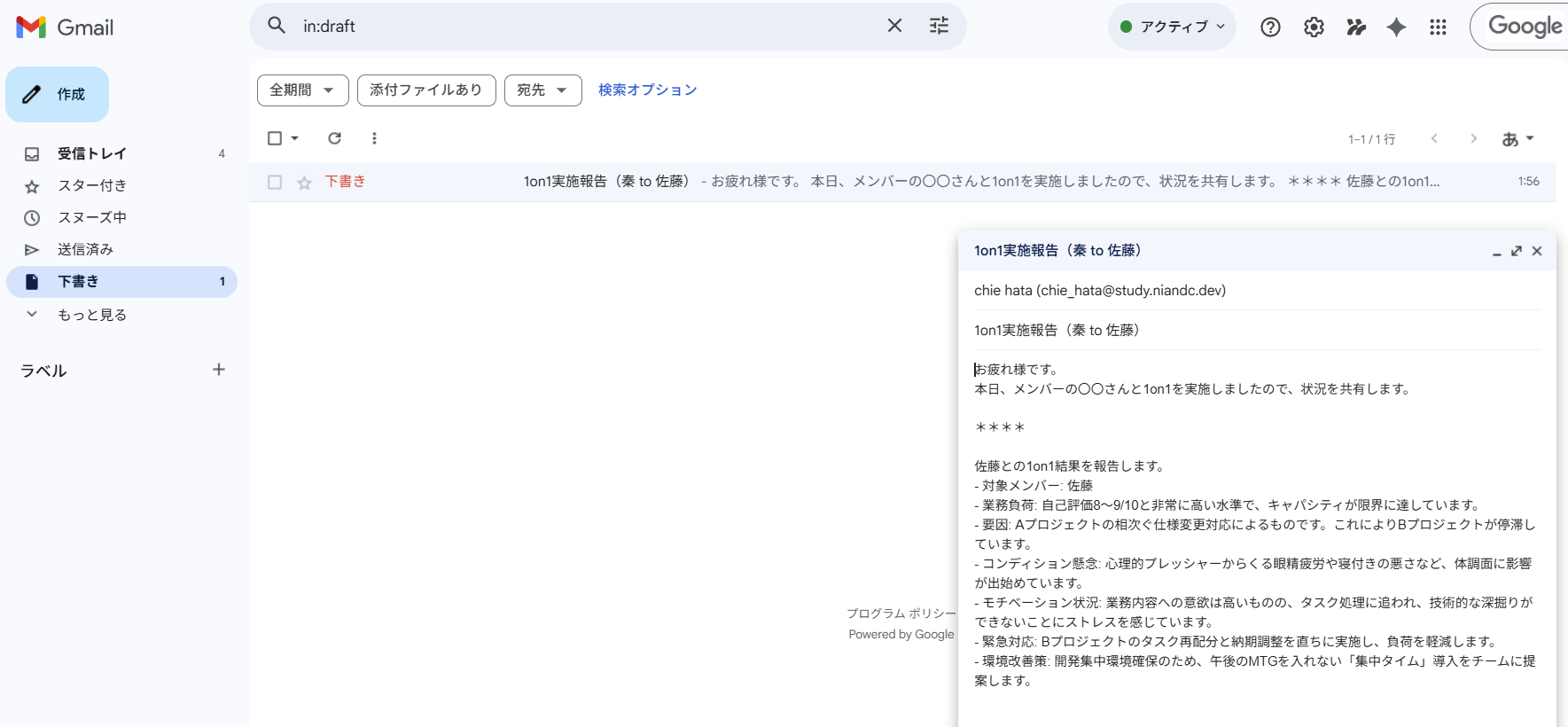 メール下書きの確認: Gmailの「下書き」フォルダを開きます。上司宛の報告メールが、適切なトーンで作成されていれば全ての工程が完了です!