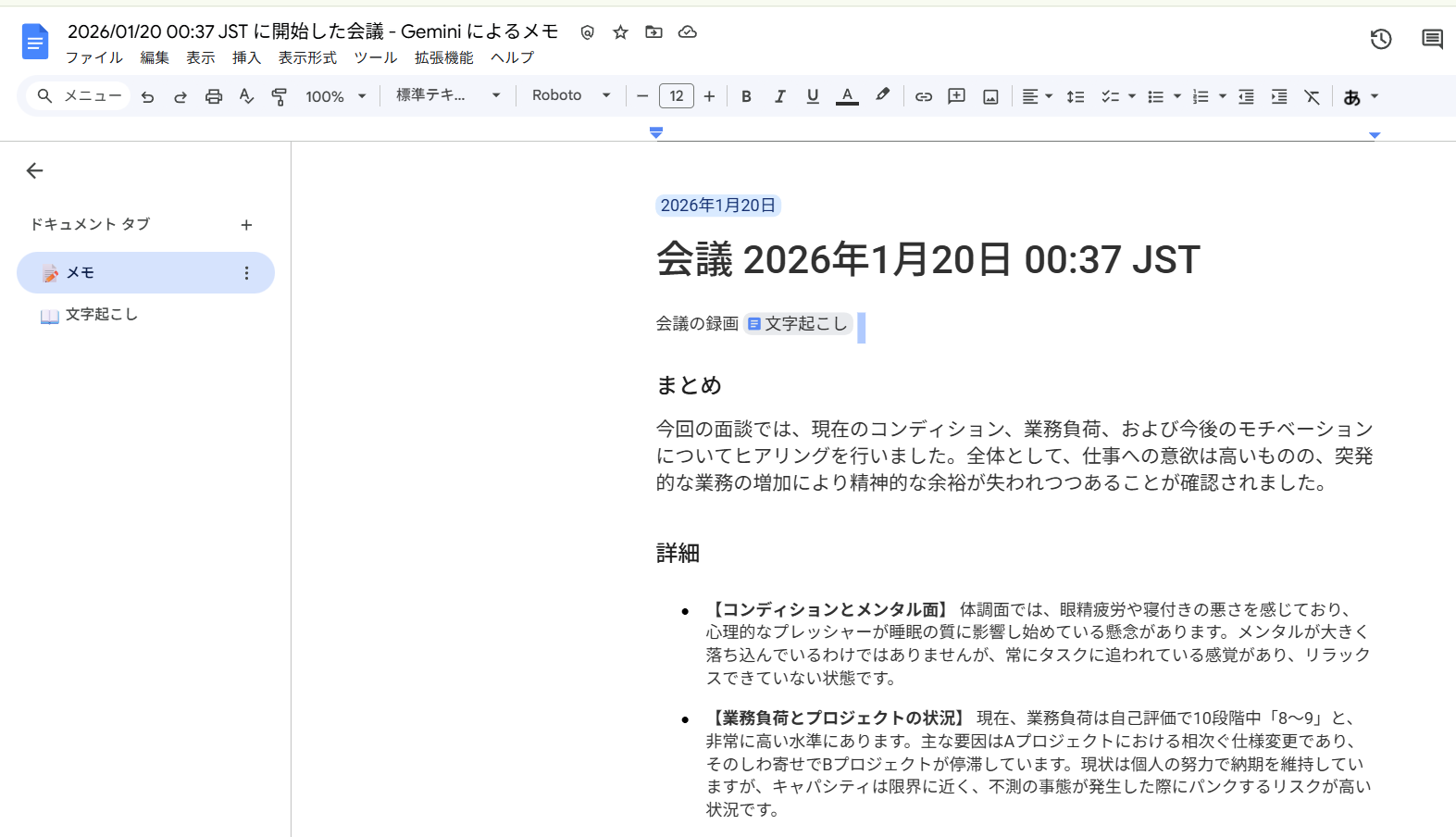 これは、チームリーダーである私とメンバーとの1on1の「会議メモ」および「文字起こし」です。