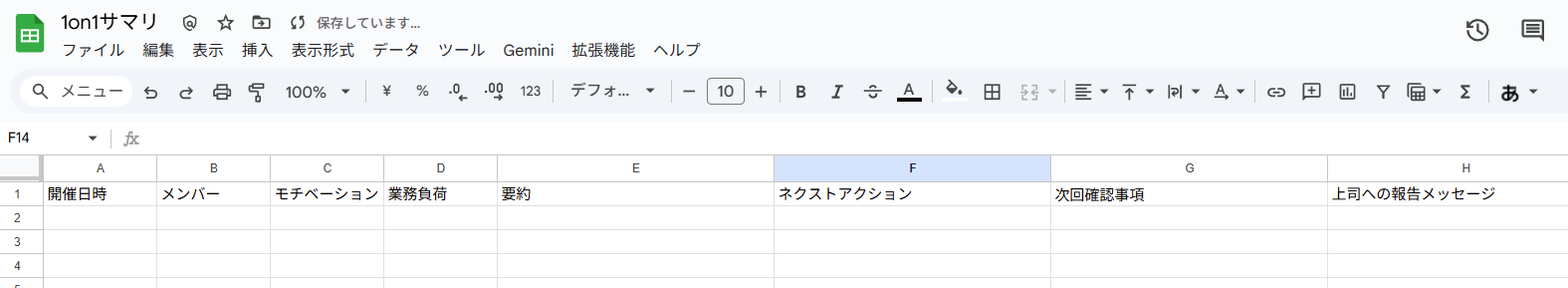 スプレッドシートの確認: 事前準備したシートを開き、新しい行に「モチベーション」や「業務負荷」の数値、「要約」などが正しく書き込まれているか確認します。