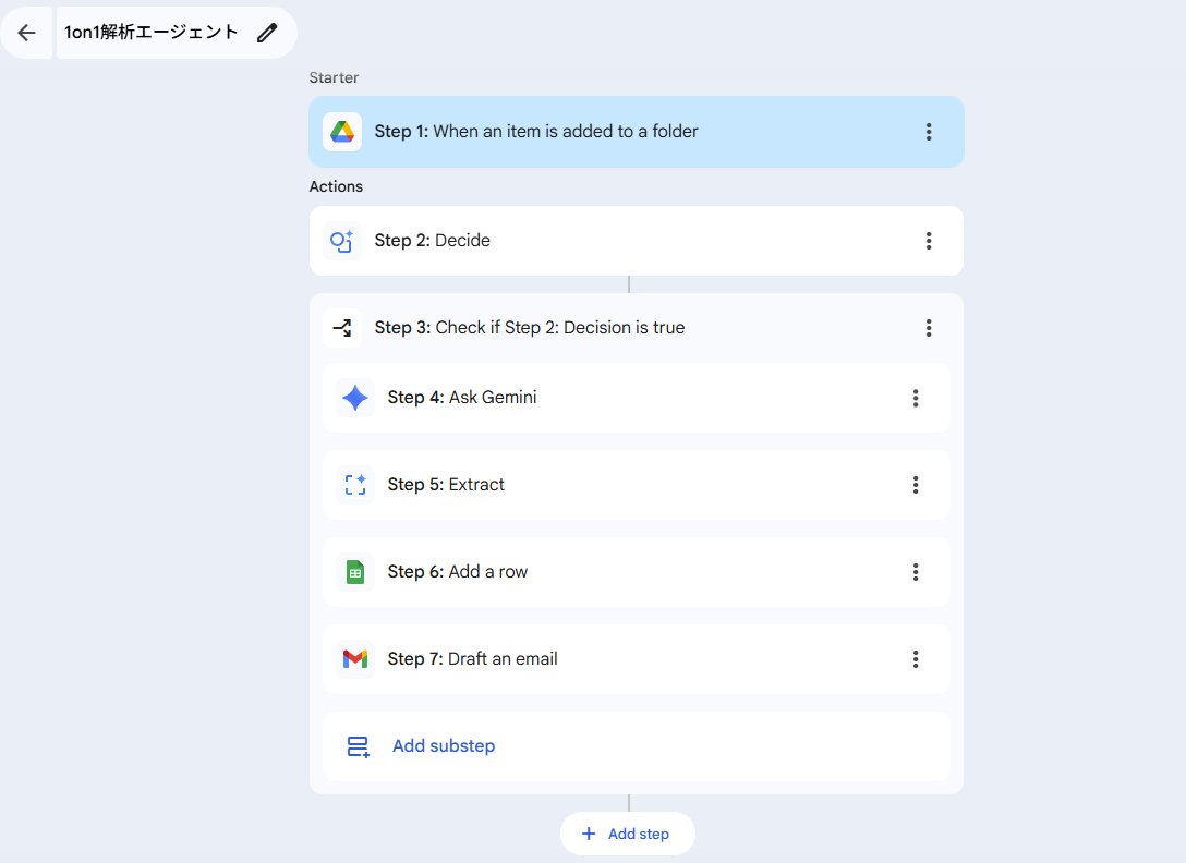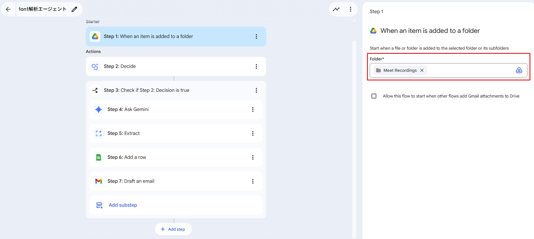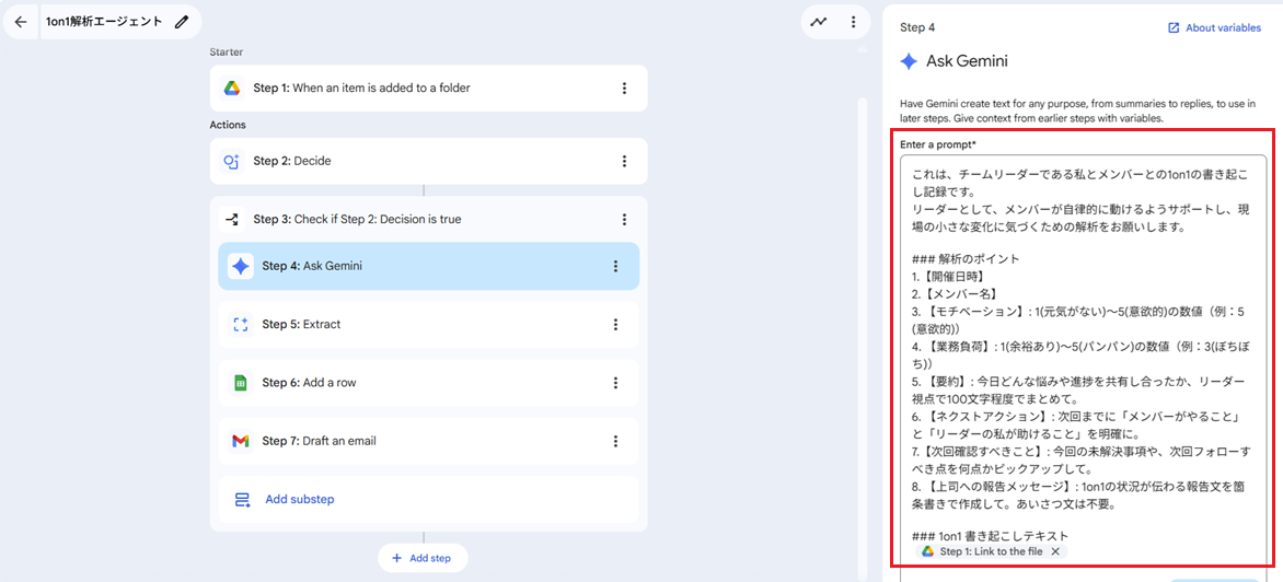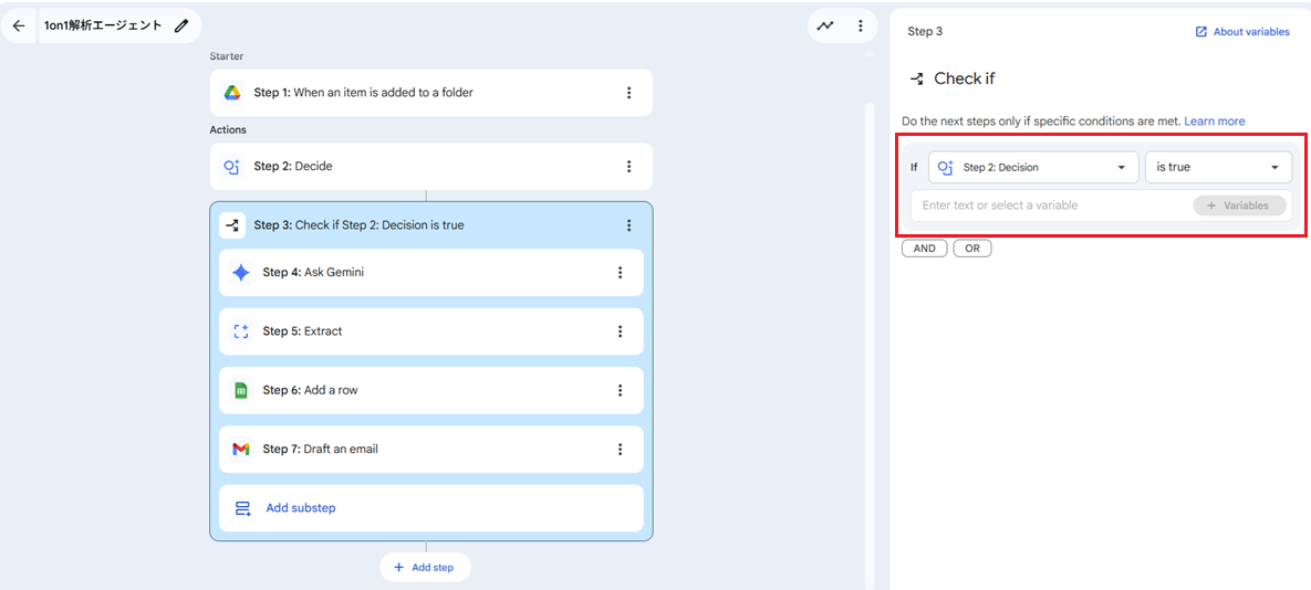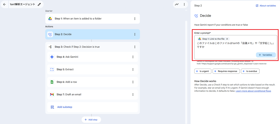 フォルダ内のすべてのファイルに反応しないよう、「Decide」を追加し、Step1のファイルに対してGeminiに「このファイルはこのファイルは1on1の「会議メモ」や「文字起こし」ですか?」と問いかけます。というのも、1on1以外の会議メモも追加されることがあるため、このフローの対象のファイルであるかを判断させます。