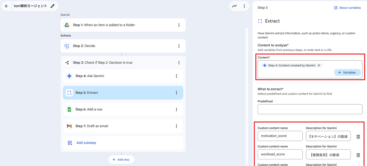 「Extract」を使って、Step4で得られた回答から必要なデータ(モチベーション、業務負荷、要約、上司への報告文など)を個別の変数として抜き出します。