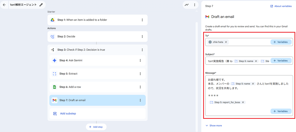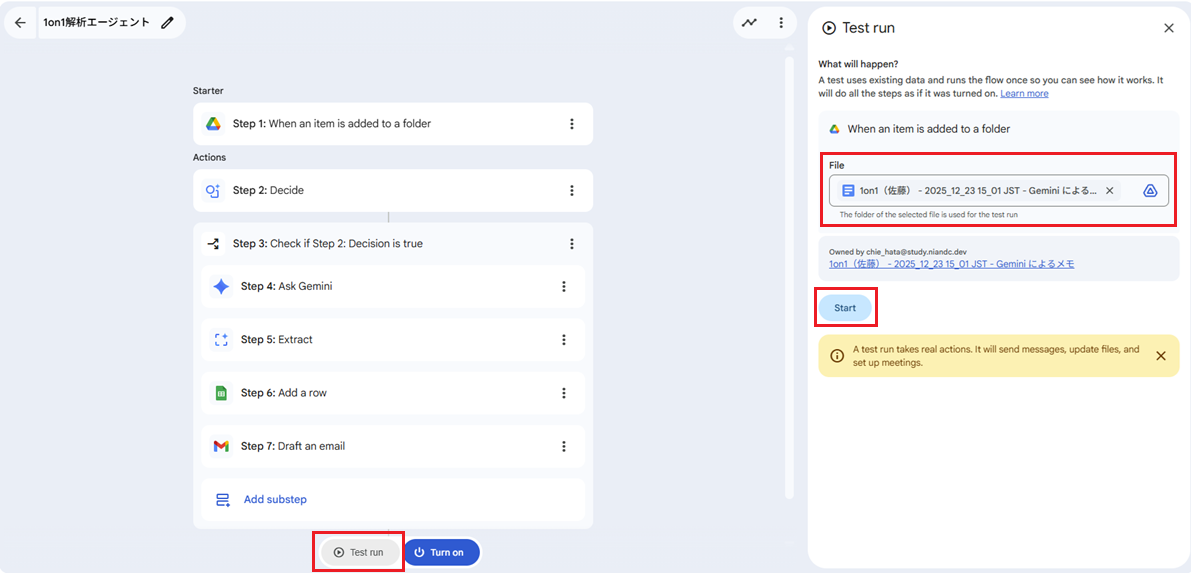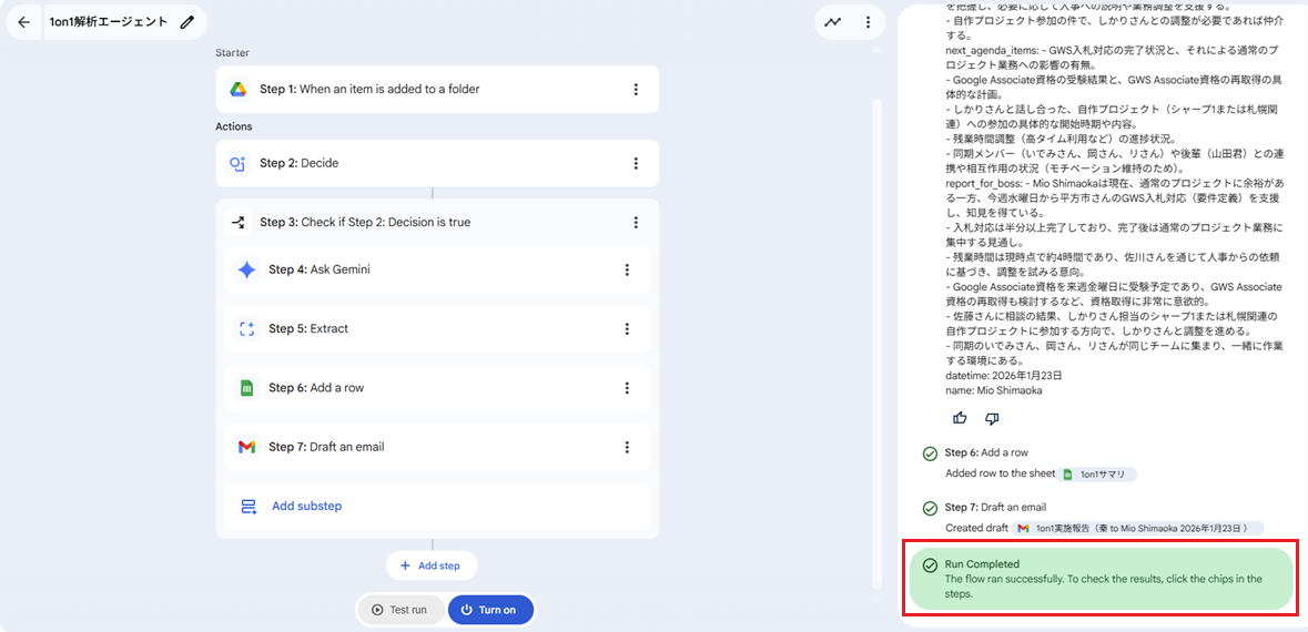 前述のとおり、会議メモのファイルは主催者のGoogleドライブに配置され。これをトリガーに、Geminiが内容をリーダー視点で解析し、スプレッドシートへの記録と上司への報告メール作成までを自動で行います。