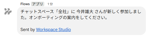 チャットスペース「[Step 1:Space name]」に [Step 1:New member display name] さんが新しく参加しました。オンボーティングの案内をしてください。