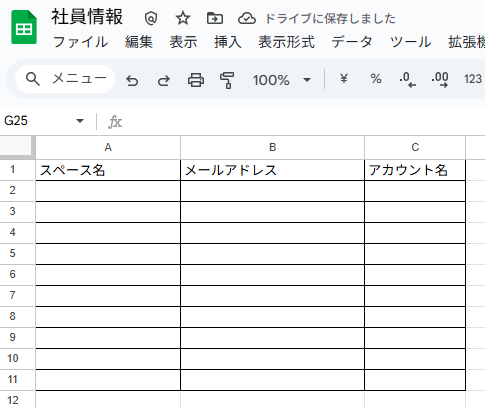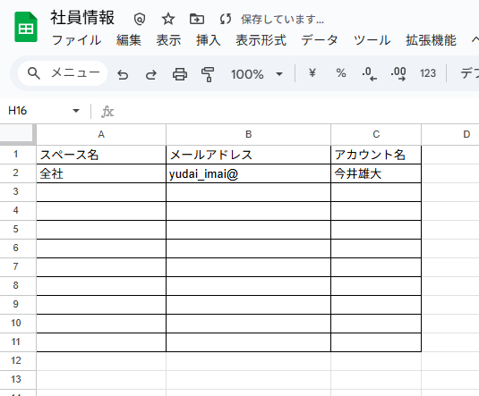 今回のブログでは社員情報を蓄積するためにスプレッドシートを利用します。今回は以下の画像のような3列のシンプルなスプレッドシート「社員情報」を作成しました。