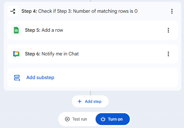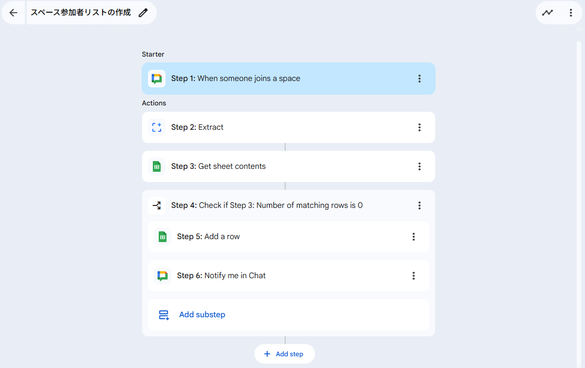 続くアクションでは、まず「Extract」ステップでメールアドレスを抽出し、続く「Get sheet contents」ステップでスプレッドシートの情報を取得します。その後の「Check if」ステップでスプレッドシートにスペース参加者情報とマッチしたレコードがあったかを確認し、マッチする行がなければ「Add a row」ステップでスペース参加者の情報をスプレッドシートに追加した後、「Notify me in Chat」ステップでスペースに参加した人がいることを伝えるチャットを実行します。
