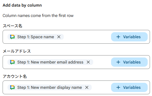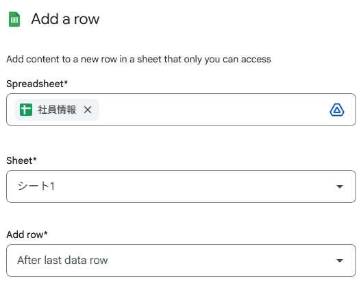 そして、Step5ではスペース参加者の情報をスプレッドシートに追加するAdd a rowステップを設定します。Spreadsheetには「社員情報」、Sheetには「シート1」、Add rowは「After last data row」となるようにします。