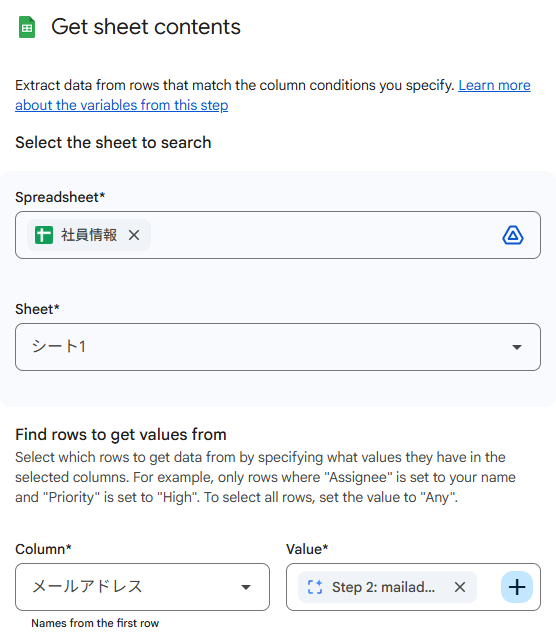 次のStep3のGet sheet contentsステップでは、今回のブログ用に作成したスプレッドシート「社員情報」を利用します。SpreadsheetにGoogle Driveから「社員情報」を入れます。Sheetはシート1のままとします。そして、Find rows to get values fromのColumnには「メールアドレス」、Valueには「Step 2:mailaddress」をプラスマークから追加します。なぜかプラスマークからStep1の参加者情報のメールアドレスが設定できなかったため、Step2の情報を利用します。