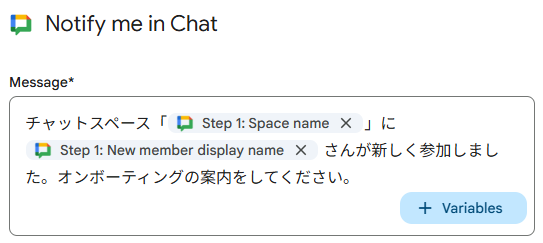 最後のStep6では、Notify me in Chatステップでスペースに新たな参加者がいることを通知します。Messageの欄に以下の内容を入力します。[]で囲まれている内容はVariablesから設定するようにしてください。