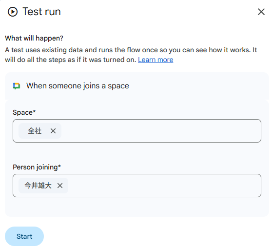今回作成したエージェントはスペースに誰かが参加しないと動作しないため、Turn onのボタンの横にあるTest runボタンからテスト実行させてみたいと思います。ボタンを押すとTest runの画面が出てくるテスト用のユーザーがPerson joiningに入っていることを確認して、Startのボタンを押してみます。
