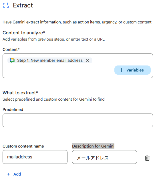 最初のActionsでは「Extract」を選択して、Contentの欄にVariablesから「Step 1:New member email address」を選択して追加します。そして、Custom content nameには「mailaddress」、Description for Geminiには「メールアドレス」を入力します。後続の「Get sheet contents」の動きからこのステップではメールアドレスを抽出する必要があります。