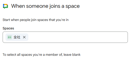 Starterで「When someone joins a space」を選択します。そして、Spacesには特定のスペースを入力して選択します。今回はブログ用に「全社」というスペースを作成したので、こちらを入力しました。