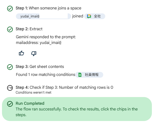 続いて、もう一度テストを実行します。そうすると、すでにスプレッドシートに存在しているアカウントとなっているため、マッチする行が1行存在しており、Check ifのステップでちゃんと終了していることがわかりました。