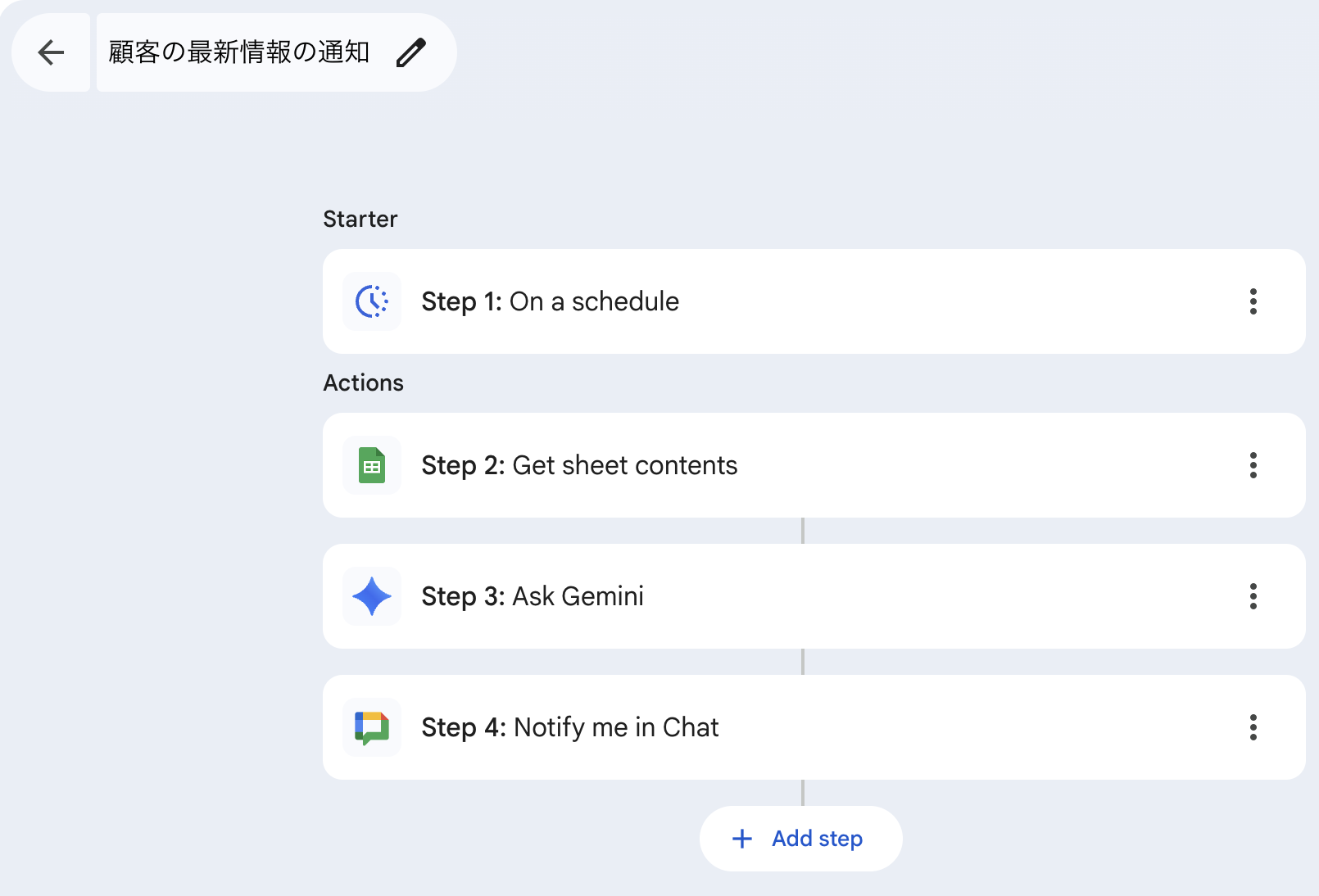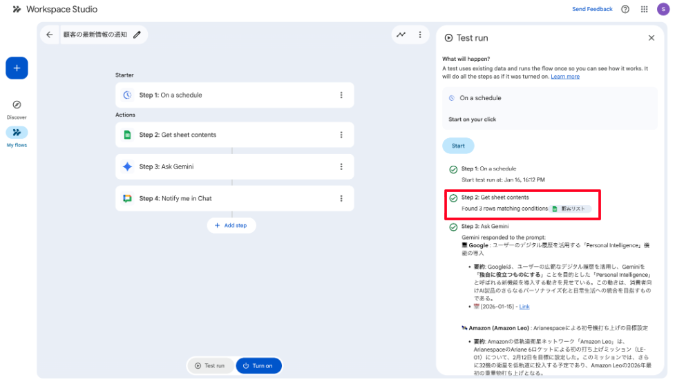 | 実現すること | スプレッドシート上で管理している顧客リストにある、顧客に関連したニュースを毎朝自動で検索し、重要な情報だけを要約してGoogle Chatに届ける |