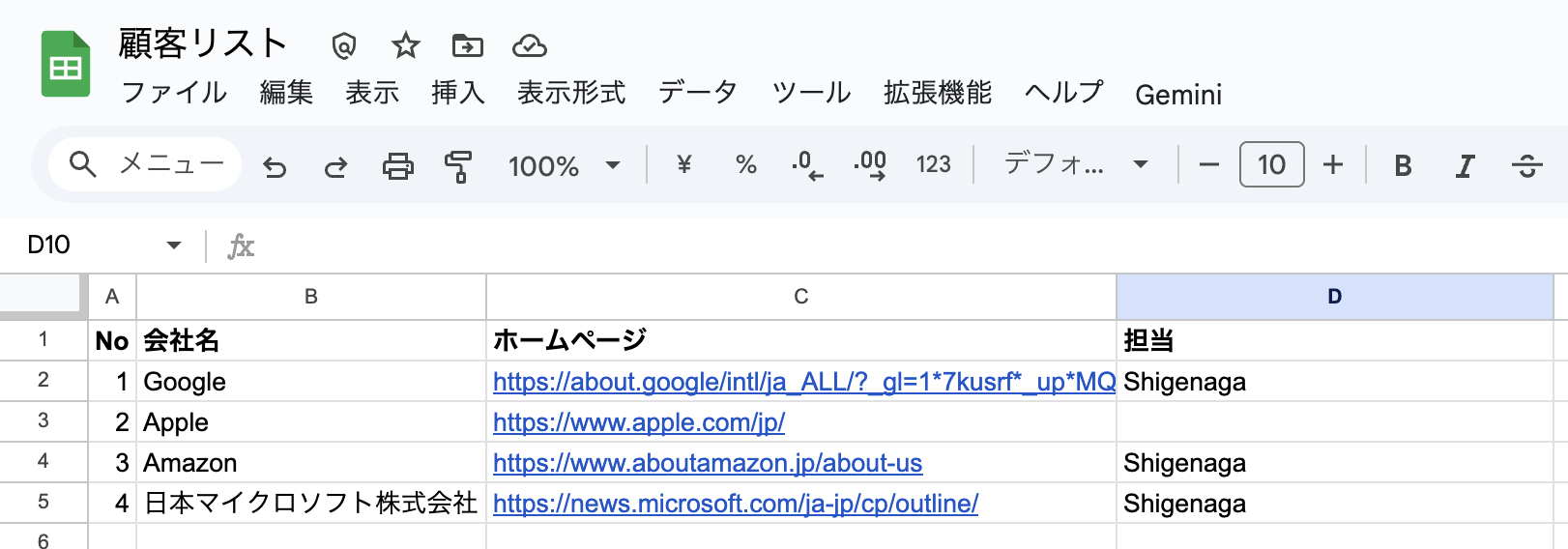 エージェントを作成する前に、まずは顧客リストをGoogleスプレッドシートで準備しておきます。