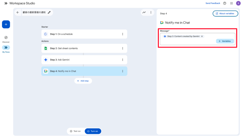 「Message」に「+ Variables」をクリックし、Step3の変数をそれぞれ割り当ててください。