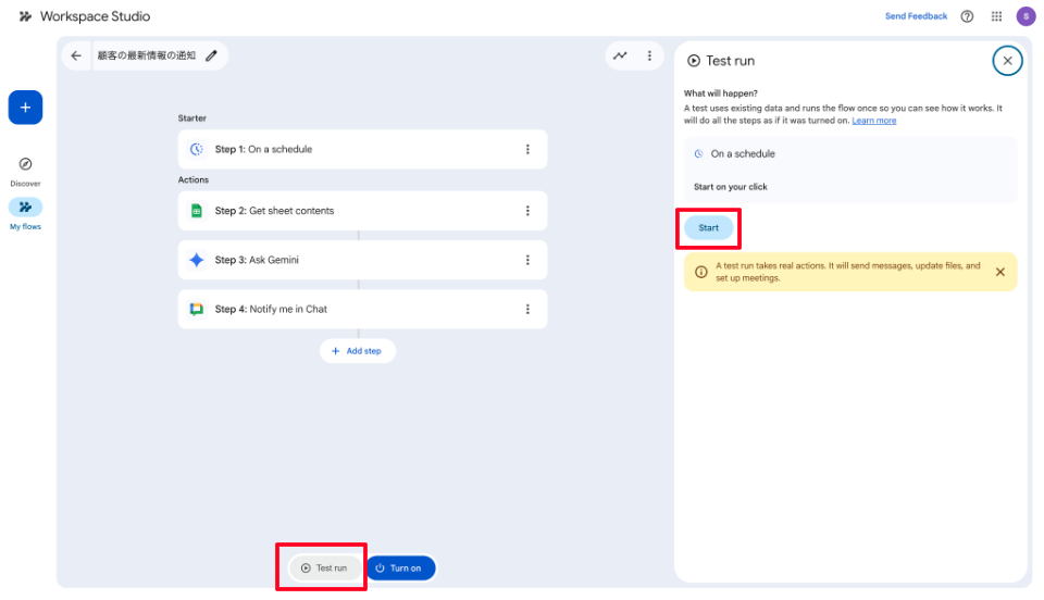 「Test run」と「Start」をクリックし、エージェントが想定どおり動作するかテスト実行します。