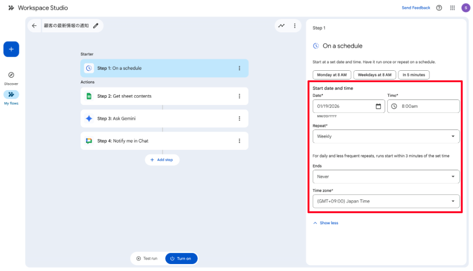 そこで今回は、Google Workspace Studio を活用して、「指定した企業のWeb上のニュースを毎朝自動で検索し、重要な情報だけを要約してGoogle Chatに届ける」 仕組みを構築します。