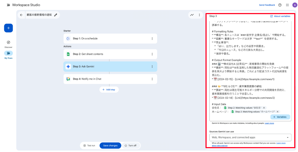 「Enter a prompt」欄に以下のプロンプトを入力し、「Sources Gemini can use」は「Web, Workspace, and connected apps」に設定します。[[[]]] で囲まれた箇所は「+ Variables」をクリックし、Step1・Step2の変数をそれぞれ割り当ててください。