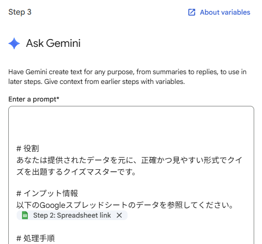 読み込んだデータの中から、Geminiにその日の問題をランダムに選ばせたいので、「Ask Gemini」を追加してプロンプトを入力します。