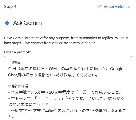 Chatへの投稿に彩りを添えたいので、もう一つ「Ask Gemini」を追加して、以下のようにプロンプトを入力し、季節や日付に合わせた挨拶を生成します。