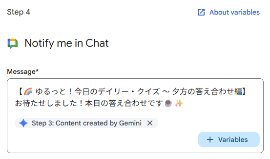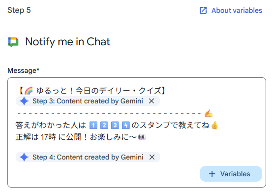作成したクイズと挨拶を届けたいので、「Notify me in Chat」※を追加します。Message欄にはStep.3とStep.4の回答を組み合わせて設定します。メッセージ欄に「回答は1️⃣2️⃣3️⃣4️⃣のスタンプで教えてね!」と一言添えておくのがポイント!