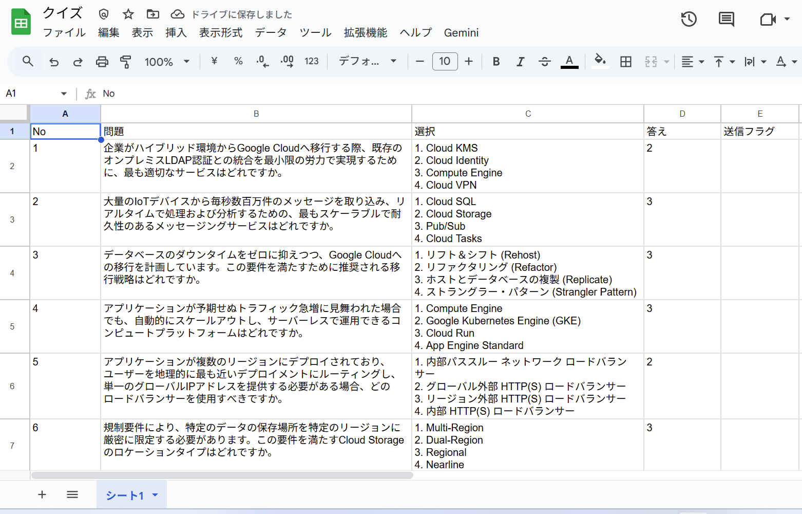 エージェントを作成する前に、土台となるクイズの「データソース」をスプレッドシートで用意します。