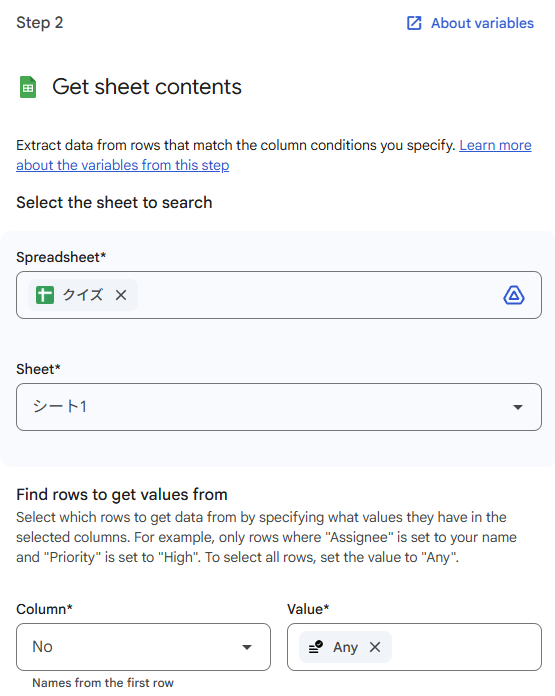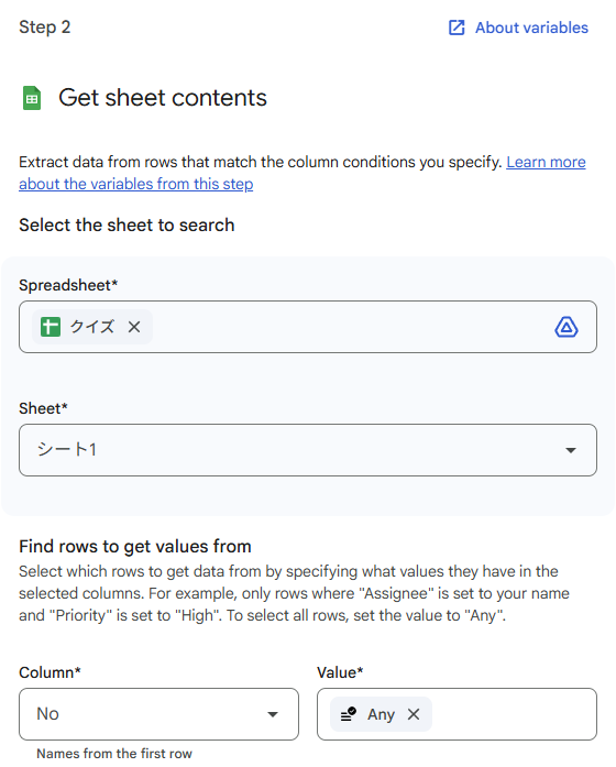 クイズのデータソースとなる情報を取得する必要があるため、「Get sheet contents」を追加して対象のスプレッドシートを指定します。