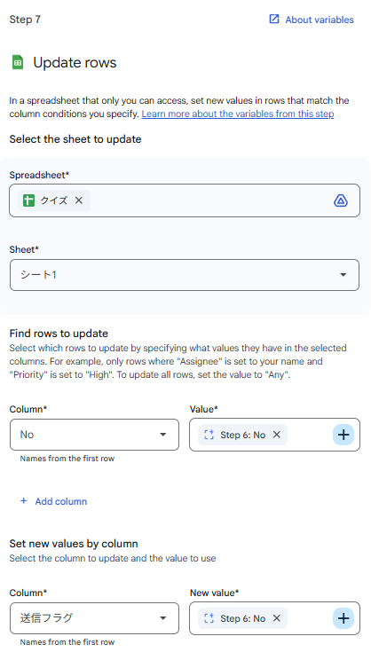 夕方に正解を出すための「目印」の書き込みのため「Update rows」を追加します。Step.6で特定したNoの行を探し、送信フラグ列(E列)値を書き込むよう設定します。