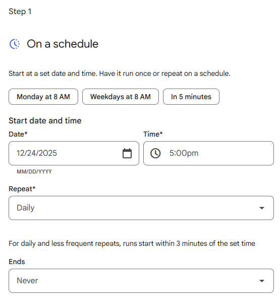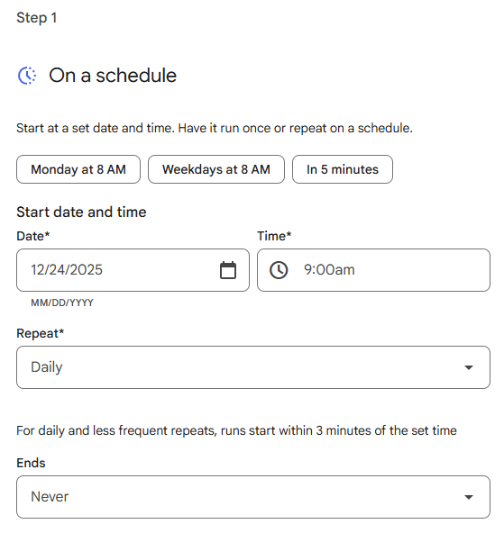 今回のエージェントは朝に定期的に実行されるようにしたいので、Starterでは「On a schedule」を選択し、9:00に送信されるよう設定します。