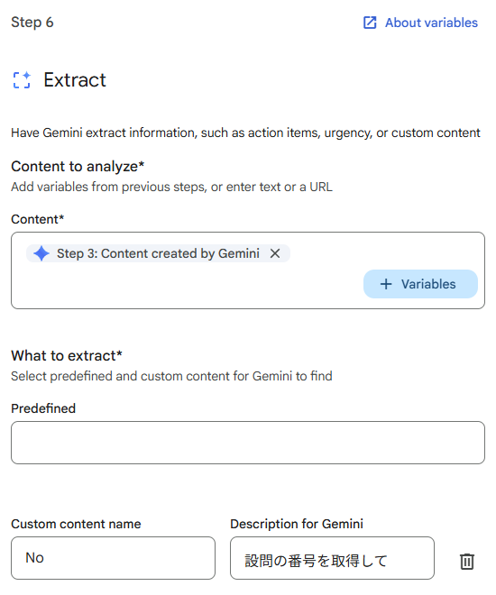 「Description for Gemini」で設問の番号のみを取得するよう指示文を記述します。