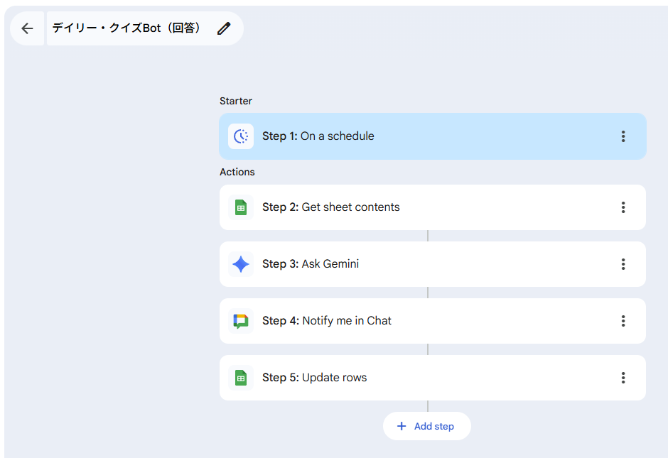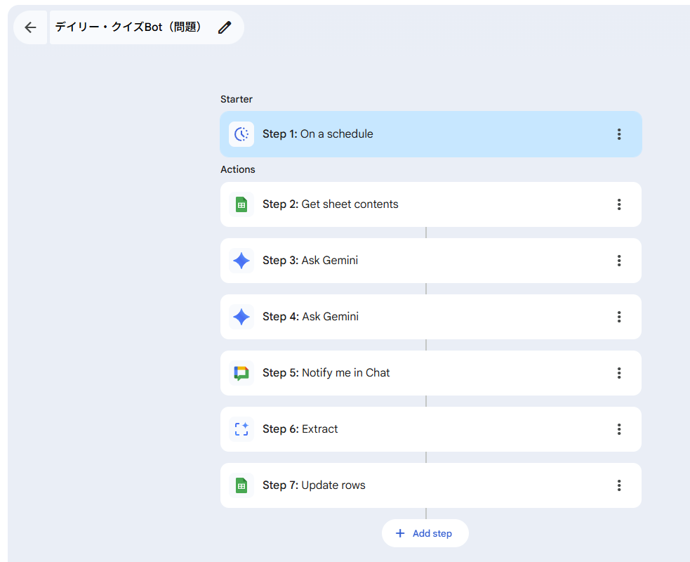 全7ステップで構築され、朝の9:00にその日の問題をスプレッドシートからランダムに選んでChatへ投稿します。