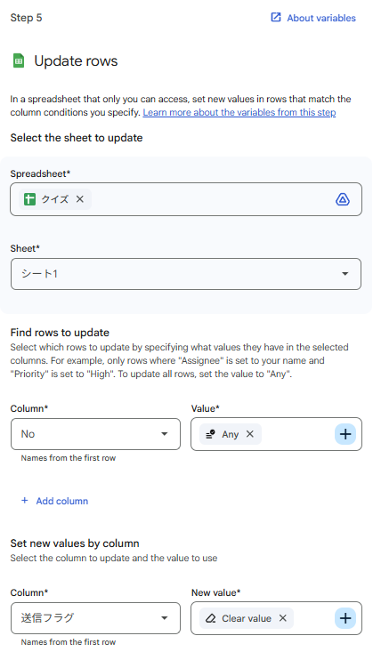 翌朝にまた新しい問題を出せる状態に戻しておきたいので、「Update rows」を追加します。フラグ列(E列)の値をすべて空(クリア)に更新するよう設定すれば完了です。