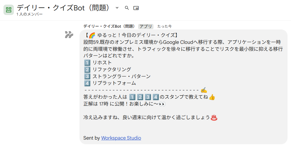 今回は、Google Workspace Studioを活用して、スキルアップを習慣化させる「デイリー・クイズBot」を作成しました。
