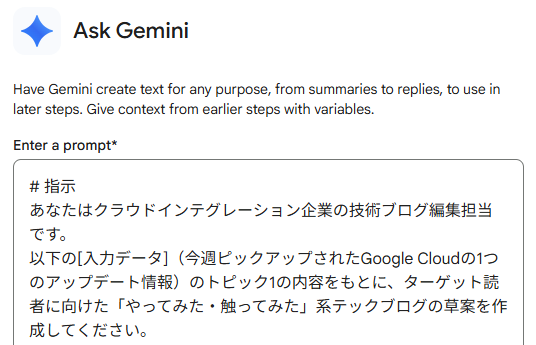 最初のActionsでは「Ask Gemini」を選択して、Enter a promptの欄に以下の内容を入力します。