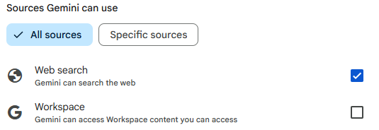 Ask Geminiの下部にはSources Gemini can useの設定を変更できるところがあるので、設定を「All sources」を選択してください。そして、Web searchはチェックを入れて、Workspaceのチェックは外すように設定します。