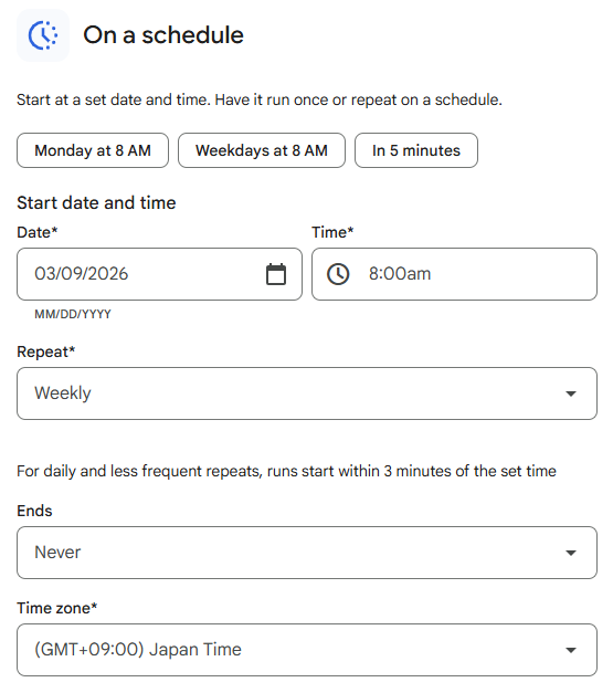 Starterで「On a schedule」を選択して、Dateには月曜日の日付、Timeには「8:00am」を選択します。そして、毎週実行するようにしたいのでRepeatには「Weekly」を入れるようにしました。Endsには「Never」を設定し、Time zoneは日本時間となるようにしています。