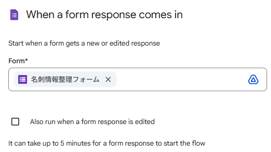 Starterで「When a form response comes in」を選択します。そして、Formの欄には前段で作成したGoogleフォームを入れるようにしてください。今回は「名刺情報整理フォーム」という名前のファイル名で作成したので、このフォームを設定します。それ以外の項目はデフォルトから変更していません。