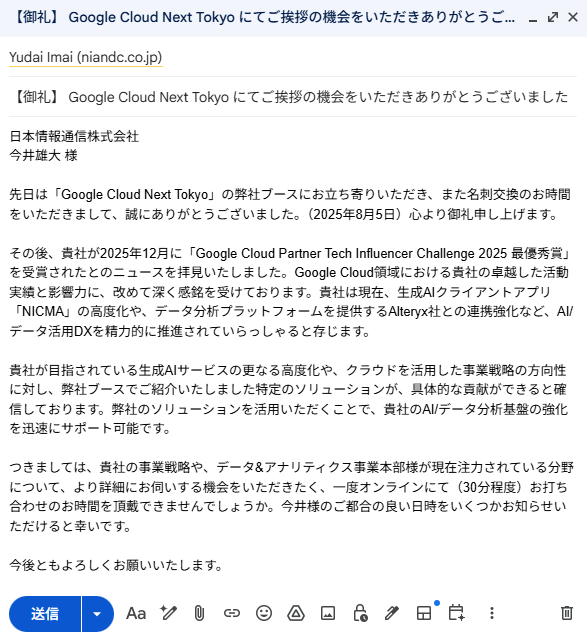 2. 相手の会社の最新情報のうち、フォローアップに活かせる要素を自然に引用する。