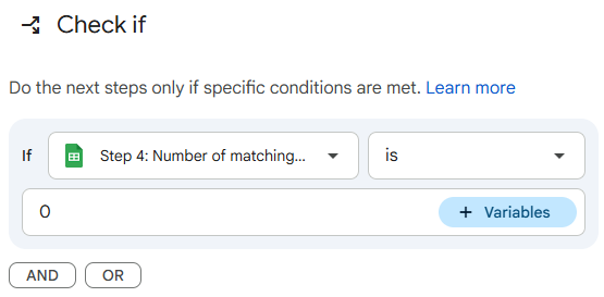 次のStep5では「Check if」を設定します。判定処理の設定については、「Step4: Number of matching rows」と「is」をプルダウンから設定し、入力欄に「0」を入力してください。