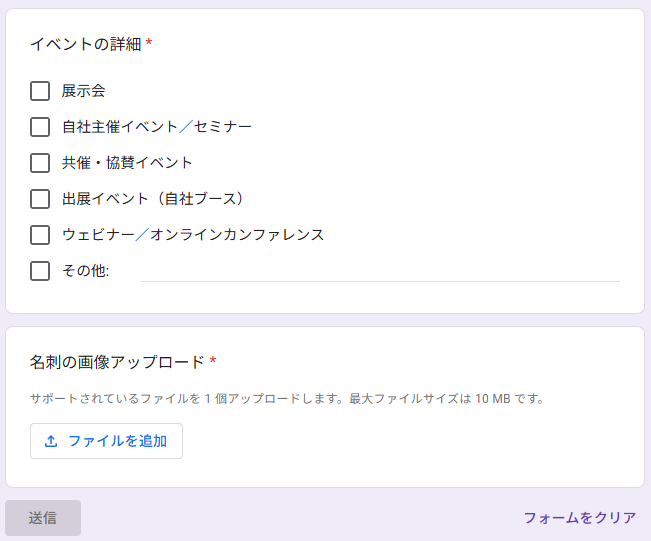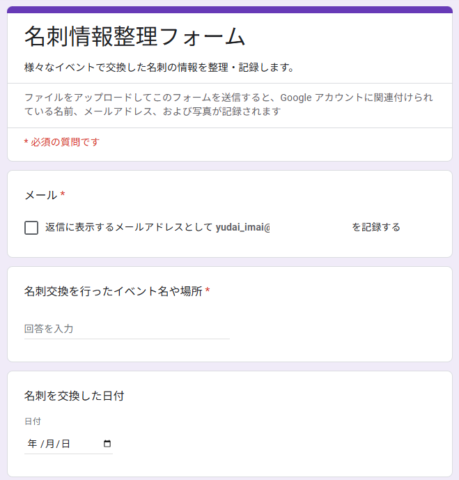 今回のブログでは名刺の情報をGoogleフォームで収集する必要があります。今回はイベントなどで名刺を交換したときに作成するお礼メールの作成を自動化するため、フォームの設問は「イベント名」、「名刺を交換した日付」、「イベントの詳細」、「名刺の画像アップロード」の最低限の4つとします。