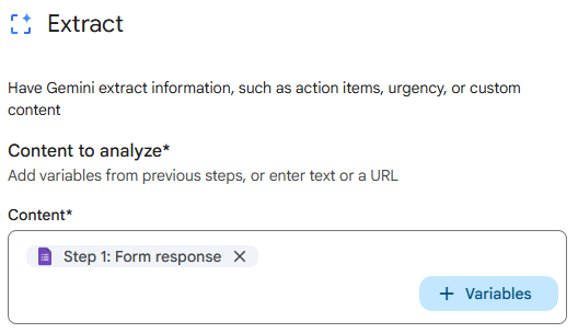 最初のActionsでは「Extract」を選択して、Googleフォームに入力された情報を抽出します。Contentの欄にはVariablesから「Step1: Form response」を設定します。