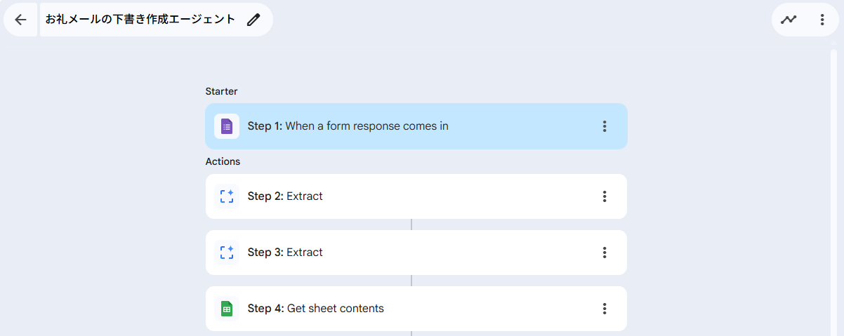 スターターとして「When a form response comes in」を設定し、特定のフォームに回答が来たときにエージェントが実行されるようにしています。