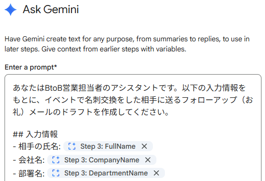 | 実現すること | 名刺を収集するフォームの回答をもとに、企業情報の最新トピックを自動取得し、イベント参加のお礼メールのドラフトを生成することができます |