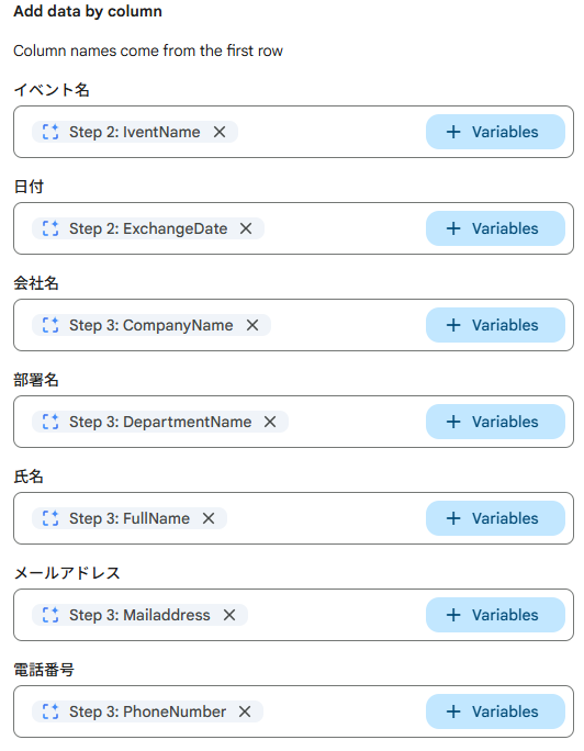 Add data by columnでは以下の表のようにすべての項目をVariablesから設定します。