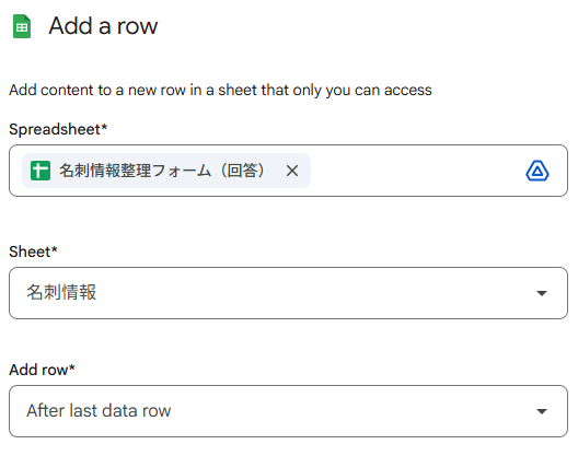 そして、Step9ではCheck ifの最後のサブステップとして抽出した名刺の情報を蓄積する「名刺情報」シートにデータを追加する「Add a row」ステップを設定します。Spreadsheetには「名刺情報整理フォーム(回答)」、Sheetには「名刺情報」、Add rowは「After last data row」を設定します。